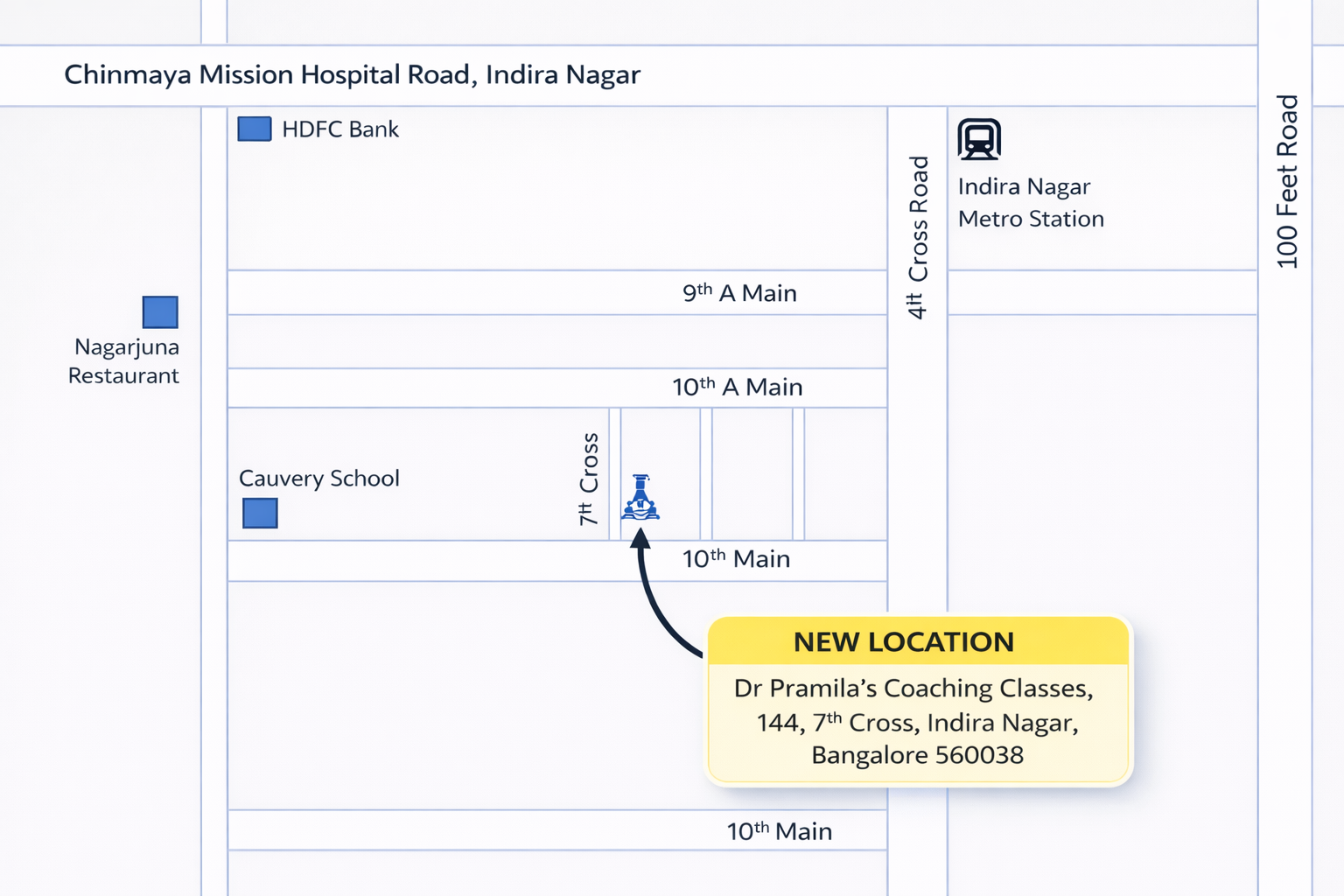 Dr. Pramila’s Coaching Classes is centrally located in Indiranagar 2nd Stage, Bengaluru and it is easily accessible by bus and metro.(5 minutes walk from the nearest bus stop and metro station)